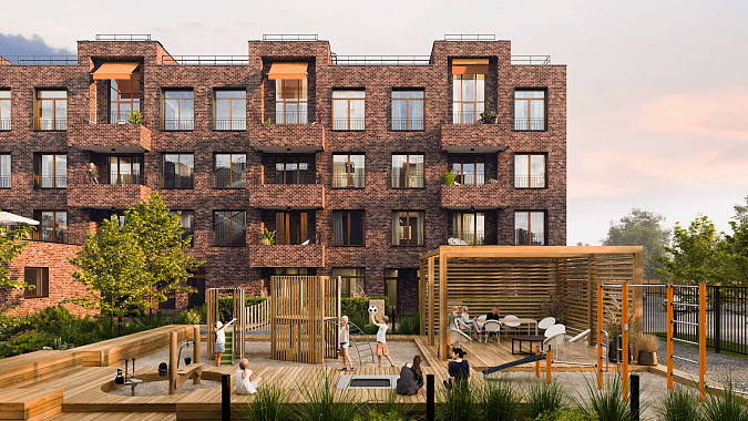 Во дворе расположены детская игровая площадка и лаунж-зона с патио из натуральных материалов.